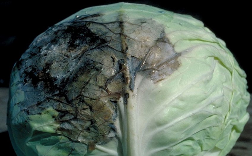 Признаки заражения чаще проявляются во второй половине вегетационного сезона. Жилки листа чернеют, образуя черную сетку. Капуста начинает гнить и издавать неприятный запах. В кочане между листьями просматриваются сухие, сморщенные, прозрачные. Они отпадают, а гниль распространяется в середину вилка.